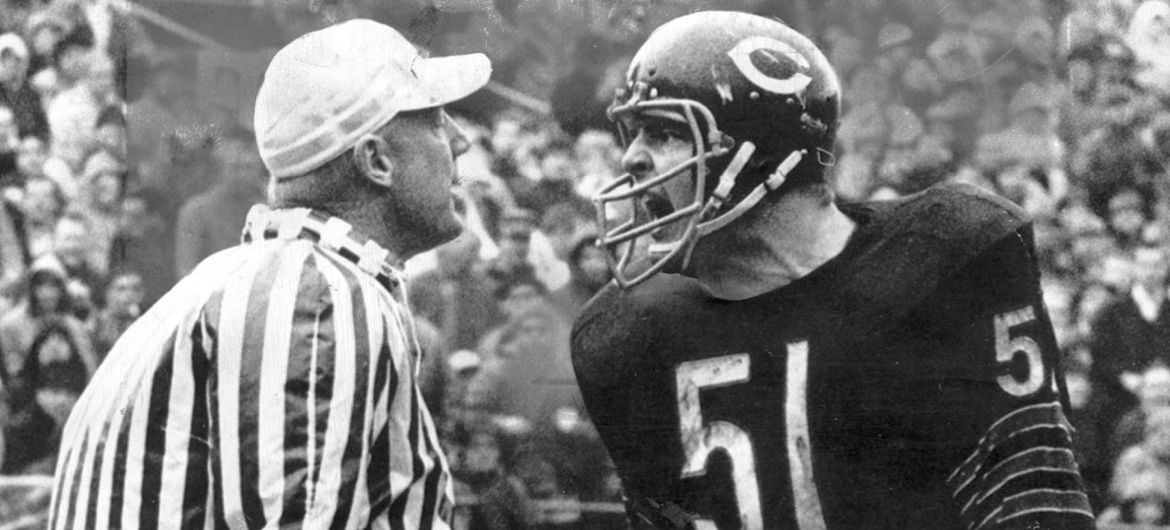 In 1965, Butkus was drafted into the NFL by his home team, the Chicago Bears. With his addition, the Midway had a brand-new lease on their future. Butkus’ years of training in college, combined with years of a powerful work ethic, led to greatness. Debuting in his now iconic jersey “number 51” in the white, burnt orange, and navy blue we all know and love, Butkus recorded 11 solo tackles in his first game. Dick Butkus, as a rookie, made an entrance into the Chicago Bears organization that served as the catalyst for dramatically reversing their fortunes and improving their struggling defense. In his first year, Butkus was a top contender for NFL Rookie of the Year honors, but was edged out by his teammate and fellow first-round draft pick, the spectacular Gale Sayers, who was drafted by the Bears during the same year.